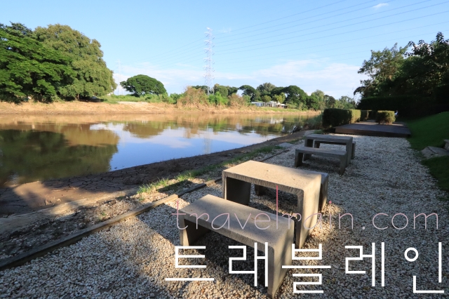 #한적한 삥 강 지점은 강변에 야외 테이블을 갖추고 있다