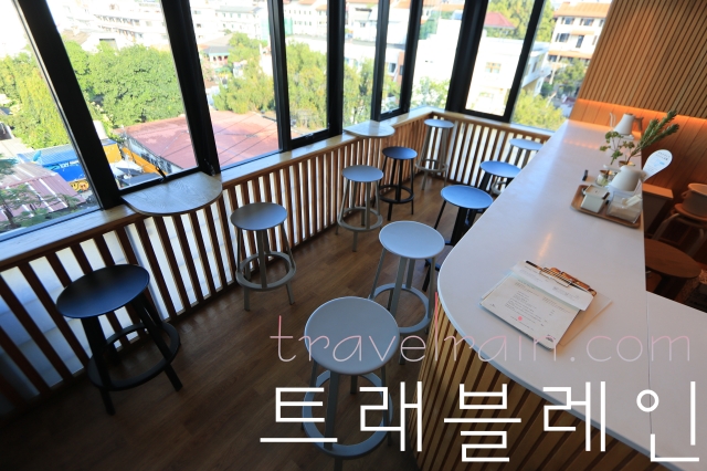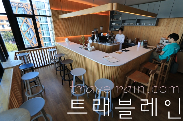 # 커피바를 중심으로 창가에 의자가 몇 개 놓여 있다